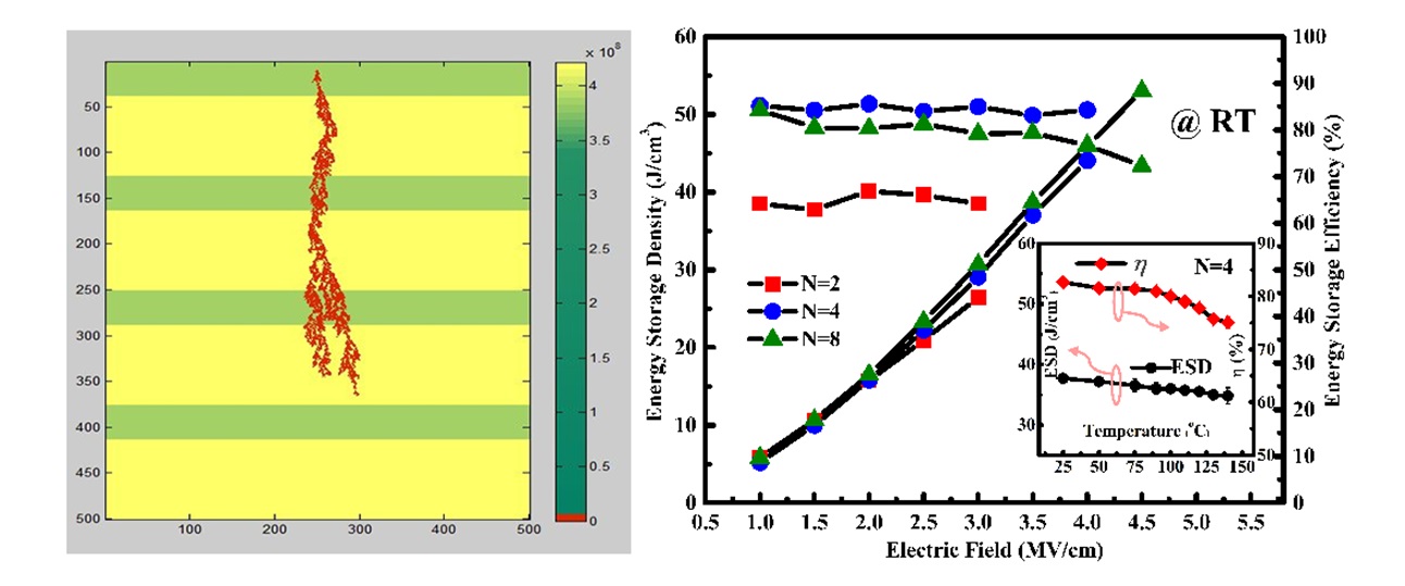 近日,西安交通大學賈春林科學家工作室劉明副教授指導的博士生孫梓雄利用射頻磁控濺射技術(shù)制備出高質(zhì)量的Ba0.7Ca0.3TiO3/BaZr0.2Ti0.8O3(BCT/BZT) 多層復合薄膜并研究了其儲能性能。研究表明在多層膜總厚度一致的情況下,通過增加周期數(shù)(BCT相與BZT相之間的界面數(shù))可以有效地提高該薄膜材料的儲能密度。同時,通過計算機仿真模擬揭示界面數(shù)的增加可以有效地阻礙電流樹枝的發(fā)展,從而通過提高樣品擊穿場強來達到材料儲能密度的提高。此類多層薄膜材料不僅表現(xiàn)出優(yōu)異的室溫儲能特性,同時在140oC下依然保持較高的儲能密度和儲能效率。這將有可能實現(xiàn)混合動力汽車前級水冷系統(tǒng)的摘除,大大降低生產(chǎn)成本和提高機電系統(tǒng)的微型化。同時,該項研究結(jié)果將對尋求更高儲能密度提供重要的實驗途徑和理論依據(jù)。