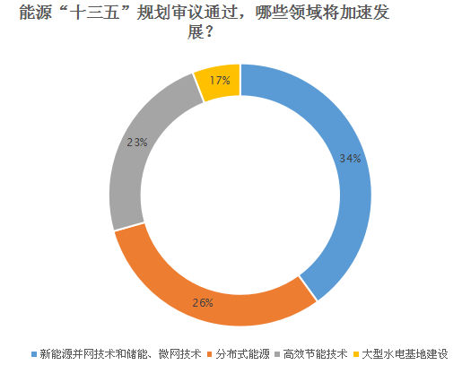 在“十三五”期間,可再生能源是否還能保持如此良好的發(fā)展勢頭?哪些領(lǐng)域?qū)⒓铀侔l(fā)展?中國電力新聞網(wǎng)以及中電傳媒微博、微信、論壇發(fā)起關(guān)于“能源“十三五”規(guī)劃審議通過,哪些領(lǐng)域?qū)⒓铀侔l(fā)展?”的話題征集活動(dòng),調(diào)查數(shù)據(jù)顯示,34%的網(wǎng)友認(rèn)為,新能源并網(wǎng)技術(shù)和儲(chǔ)能、微網(wǎng)技術(shù)在十三五期間將得到迅速發(fā)展;26%的網(wǎng)友認(rèn)為,分布式能源在“十三五”期間也將迎來機(jī)遇;除此之外,20%的網(wǎng)友認(rèn)為,高效節(jié)能技術(shù)將成為“十三五”期間能源發(fā)展的重點(diǎn);還有5%的網(wǎng)友認(rèn)為,大型水電基地建設(shè)在“十三五”期間將成為能源領(lǐng)域建設(shè)重點(diǎn)。