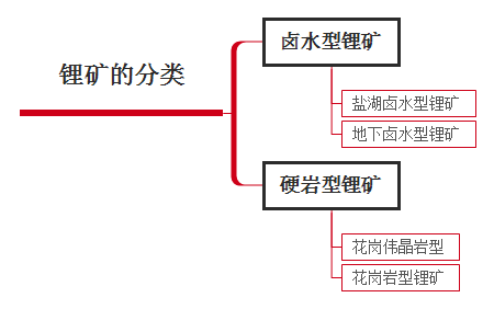 鋰礦可分為鹵水型和硬巖型兩大類,鹵水型鋰礦包括鹽湖鹵水型鋰礦和地下鹵水型鋰礦,硬巖型鋰礦包括花崗偉晶巖型鋰礦和花崗巖型鋰礦。