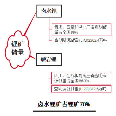 截至2015年底,我國(guó)共有鋰礦區(qū)73處,其中硬巖鋰59處、鹵水鋰14處,查明資源儲(chǔ)量折合金屬鋰540萬(wàn)噸,鹵水鋰礦占70%以上。