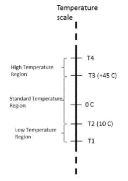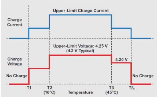 如圖1所示,JEITA規(guī)范定義了最低溫度(T1)、最高溫度(T4)和位于二者之間的三個溫度區(qū)(低、中、高),以確保充電安全。