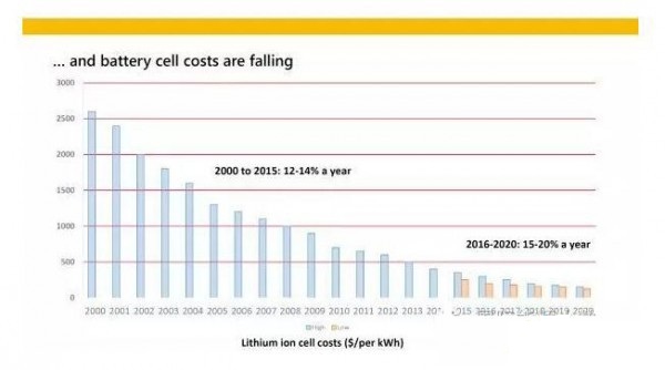 中國儲能網(wǎng)訊:根據(jù)Benchmark Mineral Intelligence的數(shù)據(jù),2000年至2015年間鋰電池的成本每年下降幅度在12-14%之間,從每千瓦時2500美元降至300美元以下;預(yù)計未來5年成本將持續(xù)下降,下降幅度每年可達15-20%。