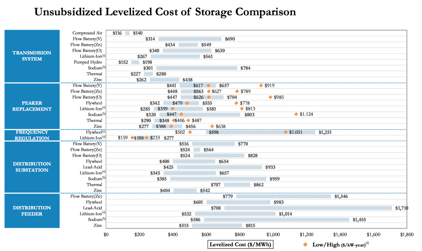 知名投資銀行拉札德(Lazard)于 2016 年 12 月發(fā)布“拉札德能源儲(chǔ)存均化成本 2.0 版”報(bào)告,比較抽蓄水力發(fā)電、壓縮空氣儲(chǔ)能、鋰電池、鉛酸電池、液流電池、鈉電池、鋅電池、飛輪、儲(chǔ)冷儲(chǔ)能,在不同電網(wǎng)應(yīng)用項(xiàng)目下的均化成本,因?yàn)椴煌夹g(shù)特性在不同的應(yīng)用方式下成本不同,其中,主流的鋰電池,與前一年的報(bào)告中的數(shù)據(jù)比較,在各種應(yīng)用上的成本都大為降低。