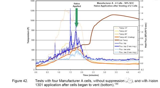 這與火焰的抑制是完全一致的。腔室的溫度和熱通量對于測試的持續(xù)時間仍然很低。需要注意的是哈龍1301的應用程序沒有冷卻細胞(圖42)。單個細胞和細胞排氣熱失控繼續(xù)應用于哈龍1301后出現(xiàn)。從指數(shù)的哈龍1301的測試所有細胞的檢查表明,他們已經(jīng)排出。然而,鹵化烴1301目前,這種方法并沒有導致。指數(shù)總結(jié)哈龍1301在控制鋰離子燃燒細胞非常有效。