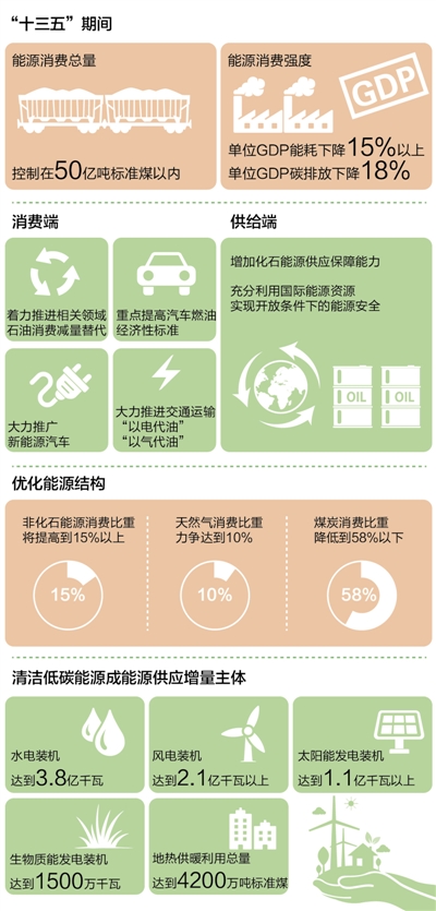 優(yōu)化能源結(jié)構(gòu)、實(shí)現(xiàn)清潔低碳發(fā)展,是推動(dòng)能源革命的本質(zhì)要求。根據(jù)《規(guī)劃》,“十三五”時(shí)期,非化石能源消費(fèi)比重將提高到15%以上,天然氣消費(fèi)比重力爭(zhēng)達(dá)到10%,煤炭消費(fèi)比重降低到58%以下。