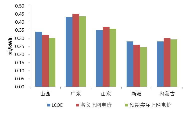 圖6. 2017年典型省LCOE與上網(wǎng)電價(jià)對(duì)比