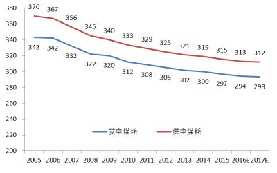 2014年來國家能源主管與環(huán)境管理部門陸續(xù)發(fā)布了煤電節(jié)能減排改造政策、計(jì)劃與推進(jìn)政策,體現(xiàn)了煤電行業(yè)能效提升的發(fā)展目標(biāo)與方向,同時(shí)也反映了主管部門對(duì)于煤電機(jī)組節(jié)能減排改造的決心與態(tài)度。根據(jù)中國電力企業(yè)聯(lián)合會(huì)公布的數(shù)據(jù),截至2016年11月全國煤電機(jī)組平均供電煤耗為313gce/kWh,在2015年的基礎(chǔ)上進(jìn)一步下降了2gce/kWh。我們預(yù)計(jì)2017年供電煤耗會(huì)進(jìn)一步降低到312 gce/kWh。