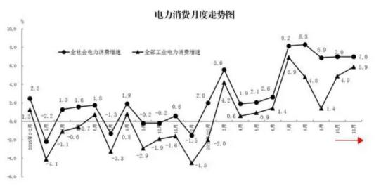 分產(chǎn)業(yè)看,1-11月份,第一產(chǎn)業(yè)用電量1002億千瓦時(shí),同比增長(zhǎng)5.2%,占全社會(huì)用電量的比重為1.9%;第二產(chǎn)業(yè)用電量38119億千瓦時(shí),同比增長(zhǎng)2.6%,增速比上年同期提高3.7個(gè)百分點(diǎn),占全社會(huì)用電量的比重為70.8%;第三產(chǎn)業(yè)用電量7286億千瓦時(shí),同比增長(zhǎng)11.7%,增速比上年同期提高4.4個(gè)百分點(diǎn),占全社會(huì)用電量的比重為13.5%;城鄉(xiāng)居民生活用電量7441億千瓦時(shí),同比增長(zhǎng)11.4%,增速比上年同期提高6.7個(gè)百分點(diǎn),占全社會(huì)用電量的比重為13.8%。