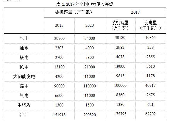 展望2017年電力供應(yīng)形勢(shì),重點(diǎn)是各類電源的投產(chǎn)新增情況。其中,由于水電和核電建設(shè)周期長(zhǎng),新增供應(yīng)能力較為明確。據(jù)相關(guān)項(xiàng)目資料統(tǒng)計(jì),預(yù)計(jì)2016-2017年水電將新增發(fā)電能力480萬千瓦,核電將新增發(fā)電能力1378萬千瓦;到2017年,我國水電裝機(jī)規(guī)模將達(dá)到3.02億千瓦,核電裝機(jī)規(guī)模將達(dá)到4078萬千瓦。另據(jù)有關(guān)分析,2017年預(yù)計(jì)新增風(fēng)電并網(wǎng)裝機(jī)容量2000萬千瓦、新增光伏發(fā)電并網(wǎng)裝機(jī)容量1800萬千瓦。由此可得2017年全國電力供應(yīng)能力展望(表1)。
