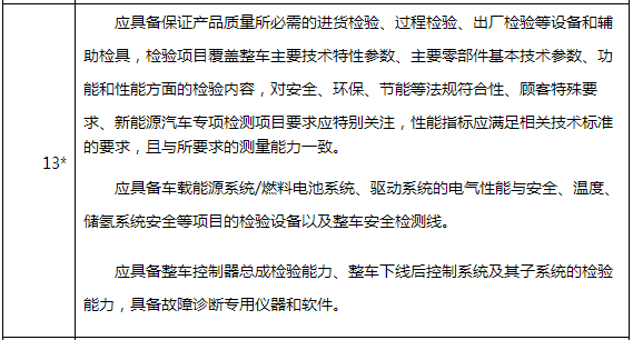 ②2017版提出了“應具備車載能源系統(tǒng)/燃料電池系統(tǒng)、驅(qū)動系統(tǒng)的電氣性能與安全、溫度、儲氫系統(tǒng)安全等項目的檢驗設備以及整車安全檢測線。應具備整車控制器總成檢驗能力、整車下線后控制系統(tǒng)及其子系統(tǒng)的檢驗能力,具備故障診斷專用儀器和軟件?!保ㄗⅲ哼@是一致性保證能力的否決項之一)。