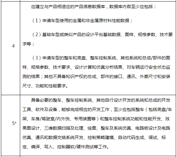(2)2017版對設計開發(fā)能力的要求是一共8項,其中3個否決項,占比約36%,在2009版是是一共6項,其中2個否決項,占比33.3%。2017版設計開發(fā)能力要求新增否決項要求為“具備必要的整車、整車控制系統(tǒng)、其他自行設計開發(fā)的系統(tǒng)和總成的開發(fā)工具、軟件及設備,能夠完成相應的開發(fā)工作,至少應包括整車(包括底盤/車架、車身/駕駛室/內(nèi)外飾、專用裝置等)和整車控制系統(tǒng)功能和性能開發(fā)、效果圖設計、三維數(shù)據(jù)掃描及處理、繪圖、整車及系統(tǒng)仿真、電路板設計及電路仿真、通訊和數(shù)據(jù)交換系統(tǒng)開發(fā)、控制策略建模、自動代碼生成、調(diào)試、標定、編譯、寫入、控制器軟/硬件測試等工作。”