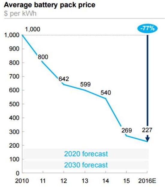 根據(jù)Mckinsey&Company(麥肯錫)的一份研究顯示:電池包的平均價(jià)格從2010年到2016年下降了高達(dá)77%,2016年平均價(jià)格大概在227美元/kWh左右,2030年平均價(jià)格將低于100美元/kWh(圖1)。而特斯拉宣稱其電池包價(jià)格在2016年上半年已經(jīng)小于190美元/kWh,低于Mckinsey & Company的227美元/kWh平均值。而特斯拉超級工廠的開業(yè)在2016年中旬,如此看來,貌似在超級工廠發(fā)揮作用之前,特斯拉的電池價(jià)格也已經(jīng)下降了很多。到底超級工廠還能為特斯拉后面的電池價(jià)格下降帶來多大的推動(dòng)作用,還要拭目以待。
