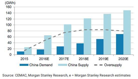摩根斯坦利研究報(bào)告認(rèn)為:給特斯拉超級工廠帶來潛在風(fēng)險(xiǎn)的主要是來自中國電池市場的挑戰(zhàn)。中國電動(dòng)汽車市場的快速升溫使得中國本土電池制造商的電池價(jià)格在過去幾年下降了很多,并且這種下降趨勢還會(huì)繼續(xù)持續(xù)下去。此外,全球電池市場需求量已經(jīng)呈現(xiàn)供過于求的局面,尤其以中國市場最為顯著(圖2)。一方面這將驅(qū)使電池價(jià)格的進(jìn)一步下降,另一方面,中國本土市場過剩的電池也會(huì)逐漸向外擴(kuò)散銷往其他國家市場(圖3)。2017年動(dòng)力電池的合同價(jià)格將可能達(dá)到150美元/kWh,而非工業(yè)界通常預(yù)期的200美元/kWh。因此,中國電池市場的發(fā)展?fàn)顩r,將直接影響特斯拉超級工廠的前途。