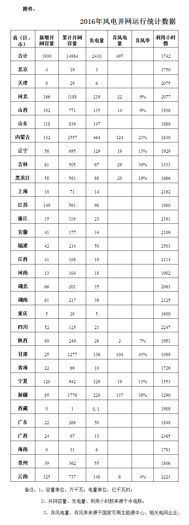 2016年,全國(guó)新增并網(wǎng)容量較多的地區(qū)是云南(325萬(wàn)千瓦)、河北(166萬(wàn)千瓦)、江蘇(149萬(wàn)千瓦)、內(nèi)蒙古(132萬(wàn)千瓦)和寧夏(120萬(wàn)千瓦),風(fēng)電平均利用小時(shí)數(shù)較高的地區(qū)是福建(2503小時(shí))、廣西(2365小時(shí))、四川(2247小時(shí))和云南(2223小時(shí))。