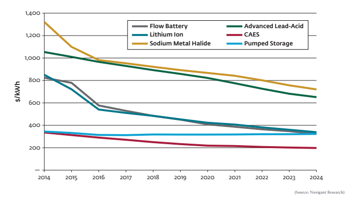 2014-2024全球公共事業(yè)規(guī)模儲(chǔ)能系統(tǒng)成本發(fā)展趨勢(shì)(按技術(shù)類型)