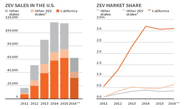 如果算上已經(jīng)與采用加州電動(dòng)汽車“積分制”標(biāo)準(zhǔn)的其他9個(gè)州,加州及采用加州標(biāo)準(zhǔn)的其他9州占全美汽車市場(chǎng)的40%。加州也是美國(guó)最大的電動(dòng)汽車市場(chǎng),2016年加州電動(dòng)汽車保有量約占全美55%,可以說(shuō)形成了事實(shí)上的加州系。