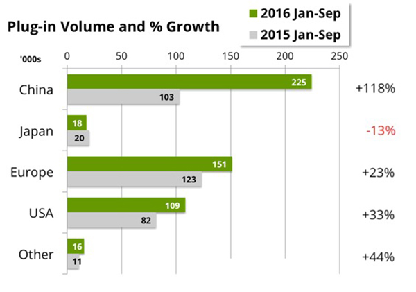 2016年(1~9月)世界主要區(qū)域市場(chǎng)電動(dòng)汽車增長(zhǎng)情況圖