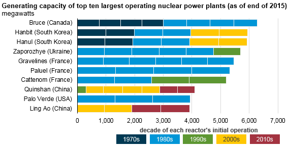 近年來,全球十大核電站名單發(fā)生了變化。日本的三座核電站已不在名單之上。這三座核電站每座發(fā)電容量超過4000兆瓦,在福島第一核電站事故后停止運(yùn)行。而中國(guó)兩座核電站躋身十大核電站新名單,分別是秦山核電站和嶺澳核電站。中國(guó)正在增建大型核電站。例如,2015年底,位于中國(guó)大連附近的紅巖河核電站容量為3183兆瓦,但隨著2016年另一個(gè)1000兆瓦的反應(yīng)堆的啟動(dòng),該電站當(dāng)前容量達(dá)4183兆瓦,此外還有兩座反應(yīng)堆在建中。