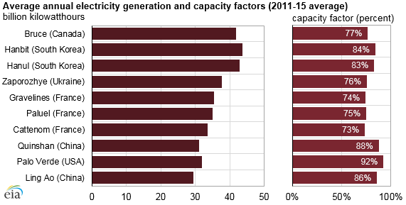 全球十大在運(yùn)核電站中,美國(guó)帕洛弗迪核電站的反應(yīng)堆數(shù)量最少(近三座),但容量系數(shù)最高。根據(jù)最近五年的數(shù)據(jù)(2011-15年),帕洛弗迪核電站的容量系數(shù)平均達(dá)92%,而其他大型核電站的容量系數(shù)則介于73%至88%之間。