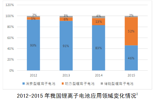 2015年我國鋰離子電池累計完成產量56.0億自然只,同比增長3%[國家統(tǒng)計局]。雖然我國鋰離子電池產量僅實現(xiàn)小幅增長,但鋰電池應用領域卻發(fā)生了根本性變革,動力型鋰電池市場份額首次超過消費型鋰電池,達到52%,較2014年提升了約39個百分點。預計今后動力型鋰電池將繼續(xù)主導鋰電池市場,消費型鋰電池市場還會進一步下滑,另外隨著動力電池梯次利用技術在儲能市場的逐步成熟,儲能型鋰電池市場規(guī)模將會擴大。