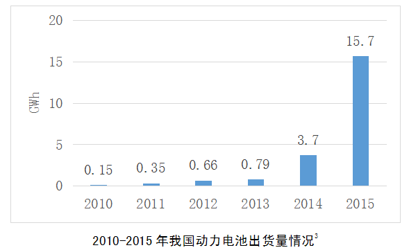 2014年以來,隨著新能源汽車產量的快速提升,車用鋰動力電池的需求持續(xù)爆發(fā),據(jù)高工鋰電數(shù)據(jù)顯示,2015年我國動力電池出貨量達到15.7GWh,同比增長3.24倍。從近5年的出貨量趨勢來看,2014年以前動力電池出貨量一直低于1GWh,2014年首次突破了3GWh,市場開始進入爆發(fā)期,這與我國新能源汽車市場的發(fā)展趨勢密切相關。