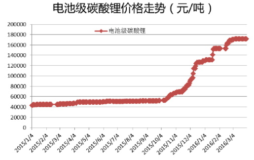 我國鋰資源豐富,但分布相對集中,重點分布于青海、西藏、四川、江西等省市,國內鋰精礦主要由天齊鋰業(yè)、眾和股份、贛鋒鋰業(yè)等少數(shù)企業(yè)提供。受鋰資源供應高度集中、少數(shù)企業(yè)主導價格、碳酸鋰需求增加等諸多因素影響,2015年電池級碳酸鋰價格由年初的4.3萬元/噸瘋漲至年底的12.3萬元/噸,上漲近3倍。2016年以來,電池級碳酸鋰價格依舊延續(xù)了去年的上漲態(tài)勢,6月第二周市場電池級碳酸鋰成交主流在15.5-16.5萬元/噸,部分高端成交價格在16.5-17萬元/噸附近,18萬元/噸少量成交。上游鋰資源及碳酸鋰等材料價格的非理性上漲,在一定程度上對鋰電池產業(yè)的發(fā)展會產生一定的不利影響。