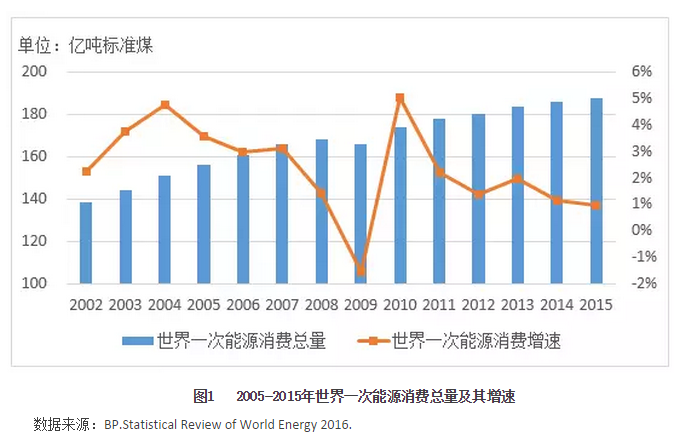 2012年以來,全球能源消費(fèi)增速顯著趨于放緩。根據(jù)BP統(tǒng)計(jì)數(shù)據(jù),2012年之前的10年間,世界一次能源消費(fèi)總量由2002年的138.8億噸標(biāo)準(zhǔn)煤增加到2012年的180.3億噸標(biāo)準(zhǔn)煤,年均增加近4.2億噸標(biāo)準(zhǔn)煤,年均增速為2.7%。這一時(shí)期較快增長的能源需求主要由高速發(fā)展的中國經(jīng)濟(jì)所拉動(dòng),10年間中國能源消費(fèi)量增加了23.4億噸標(biāo)準(zhǔn)煤,占同期世界能源消費(fèi)總增加量41.5億噸標(biāo)準(zhǔn)煤的56.4%。從2012年開始,世界能源需求呈現(xiàn)疲軟態(tài)勢(shì),增速逐步放緩,2012年、2013年、2014年和2015年世界一次能源消費(fèi)增速分別為1.4%、2.0%、1.1%和1.0%,顯著低于之前10年2.7%的年均增速(如圖1所示)。導(dǎo)致這一現(xiàn)象的原因主要有兩個(gè):一是發(fā)達(dá)國家在經(jīng)歷2007、2008年金融危機(jī)后,經(jīng)濟(jì)尚未完全復(fù)蘇,能源需求疲軟。以北美、歐洲及歐亞地區(qū)為例,2015年北美一次能源消費(fèi)量為39.9億噸標(biāo)準(zhǔn)煤,盡管與2012年相比略微增加,但仍低于2008年40.3億噸標(biāo)準(zhǔn)煤的消費(fèi)量;歐洲及歐亞地區(qū)2015年一次能源消費(fèi)量為40.5億噸標(biāo)準(zhǔn)煤,相比于2008年下降了6.2%[1]。二是新興市場國家經(jīng)濟(jì)增速放緩及產(chǎn)業(yè)結(jié)構(gòu)調(diào)整降低了能源需求增速。其中最具有代表的是中國,隨著經(jīng)濟(jì)發(fā)展進(jìn)入新常態(tài),產(chǎn)業(yè)結(jié)構(gòu)的深度調(diào)整和持續(xù)升級(jí)使得能耗較高的重工業(yè)在經(jīng)濟(jì)總量中所占的比重持續(xù)下降,能源需求進(jìn)入低速增長階段。中國的消費(fèi)增速由2011年的7.3%下降到2015年的0.9%,趨近于世界平均水平[2]。另外,根據(jù)BP的統(tǒng)計(jì)數(shù)據(jù),中國能源消費(fèi)的增長量占世界總增長量的比例由2011年的74.5%降到2015年的34.4%,對(duì)能源需求總量的拉動(dòng)作用明顯減弱。