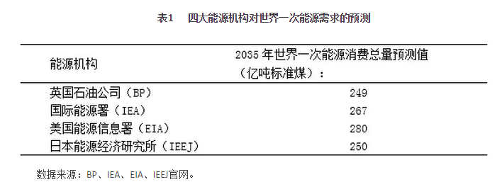 盡管當(dāng)前能源需求呈現(xiàn)疲軟態(tài)勢(shì),但是亞洲、南美洲和非洲等新興市場國家經(jīng)濟(jì)仍有較大發(fā)展空間,工業(yè)化、城鎮(zhèn)化進(jìn)程將不斷推進(jìn),人口規(guī)模持續(xù)擴(kuò)大,未來將成為全球能源需求增長的主要驅(qū)動(dòng)力。從BP、IEA等權(quán)威能源機(jī)構(gòu)的預(yù)測(cè)來看,盡管因?yàn)榻y(tǒng)計(jì)口徑及電力折一次能源方法不同導(dǎo)致對(duì)能源消費(fèi)總量的判斷存在差異,但趨勢(shì)大體相同。到2035年,世界一次能源消費(fèi)總量預(yù)計(jì)在249-280億噸標(biāo)準(zhǔn)煤的范圍內(nèi)波動(dòng)(見表1)。其中,BP的預(yù)測(cè)最為保守,2035年世界一次能源消費(fèi)總量將達(dá)到249億噸標(biāo)準(zhǔn)煤,較2015年增加約61億噸標(biāo)準(zhǔn)煤,累計(jì)增長34%,年均增長1.4%,增速與近幾年相比較有小幅的提升。