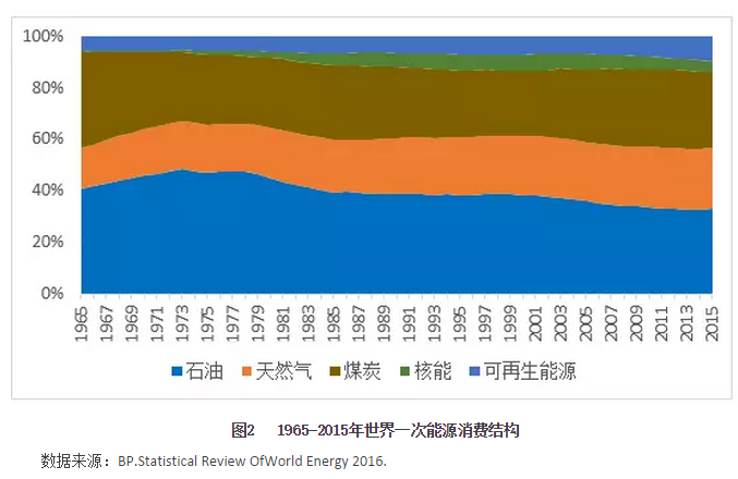 到目前為止,以煤炭、石油和天然氣為代表的化石能源在能源消費(fèi)中的主體地位仍不可撼動(dòng),但其內(nèi)部結(jié)構(gòu)卻在不斷發(fā)生變化。自第二次工業(yè)革命以來,化石能源的消費(fèi)量急劇上漲,起初形成了以煤炭為主的消費(fèi)格局。進(jìn)入20世紀(jì)以后,尤其是第二次世界大戰(zhàn)以來,石油和天然氣的消費(fèi)量持續(xù)增加,石油取代了煤炭成為最主要的能源。根據(jù)BP統(tǒng)計(jì)數(shù)據(jù),石油占世界一次能源消費(fèi)量的比重在1973年達(dá)到峰值(占比48.7%)后逐年降低,到2015年,石油占比為32.9%;天然氣所占份額不斷提升,由1965年的15.8%上升到2015年的23.9%,提高了約8個(gè)百分點(diǎn);煤炭的占比在1999年降到最低點(diǎn)后(約25%),又出現(xiàn)小幅回升,近幾年占比維持在30%左右;核能的占比在經(jīng)歷了短暫上升后又開始下滑,到2015年占比不到4.5%;可再生能源的消費(fèi)量在過去幾十年間一直穩(wěn)步增加(主要以水電為主),所占比重由1965年的5.6%上升到2015年的9.6%,提高了4個(gè)百分點(diǎn)(如圖2所示)。由此可見,迄今為止,石油仍然是最重要的能源。另外,化石能源內(nèi)部此消彼長,它占世界一次能源消費(fèi)量的比重一直維持在85%以上,核能以及可再生能源的占比依舊很小。