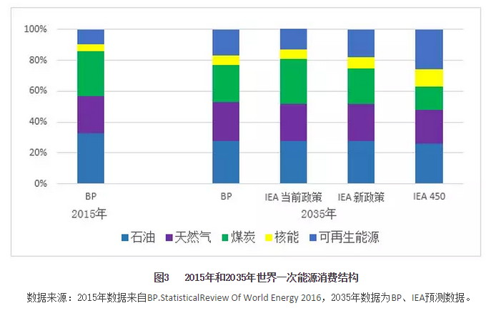 與BP的預(yù)測(cè)不同,IEA假設(shè)了三種不同的情景對(duì)未來的能源結(jié)構(gòu)進(jìn)行了預(yù)測(cè)。這三種情景的差別在于:為應(yīng)對(duì)全球氣候變化問題,各國將采取何種強(qiáng)度的行動(dòng)。若維持當(dāng)前氣候政策不變,到2035年,煤炭在一次能源消費(fèi)中的比重基本沒有發(fā)生變化,石油降低的比重被核能及可再生能源所取代;若在現(xiàn)有的基礎(chǔ)上逐步改進(jìn)氣候政策,對(duì)2035年能源結(jié)構(gòu)的預(yù)測(cè)與BP基本一致;若各國執(zhí)行最嚴(yán)格的氣候政策(IEA的“450情景”),煤炭的比重將跌至15%,同時(shí)可再生能源的比重大幅上升到26%左右(如圖3所示)。總的來說,盡管不同機(jī)構(gòu)的預(yù)測(cè)存在一定的差別,但只要各國采取一定的措施解決氣候變化的問題,未來能源結(jié)構(gòu)變化的趨勢(shì)大體相同?;茉丛谝淮文茉聪M(fèi)中的比重顯著降低,由當(dāng)前的85%降低到占75%左右。其中,石油預(yù)計(jì)以年均0.9%的速度穩(wěn)定增長,但它在一次能源中的占比卻在不斷下降,盡管如此,石油仍然是最重要的燃料;天然氣預(yù)計(jì)以年均1.8%的速度增長,成為增長最快的化石能源,到2030年將取代煤炭成為第二大燃料。另外,非化石能源的比重迅速上升,尤其是可再生能源。