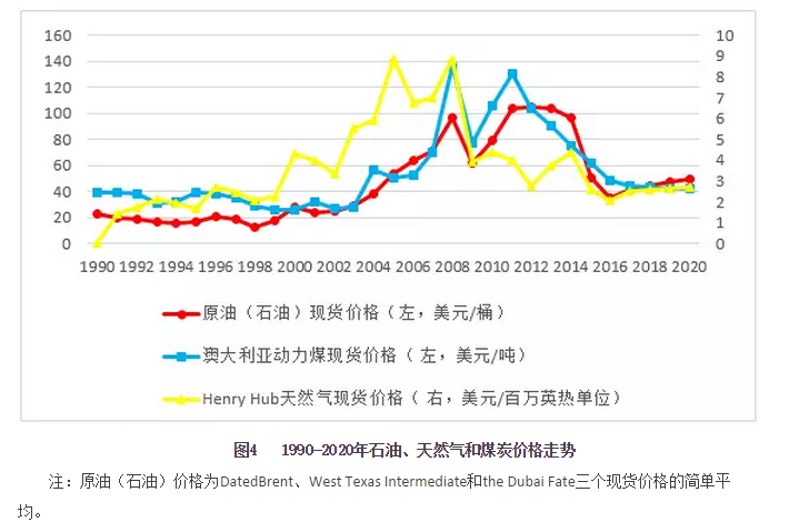 在能源價(jià)格中,油價(jià)具有典型的代表意義。一方面因?yàn)樵诒姸囝I(lǐng)域中用到的燃料和產(chǎn)品大多來自于石油。另一方面,煤炭的價(jià)格一直以來受到石油價(jià)格的直接影響,走勢(shì)大致相同;近幾年來,天然氣價(jià)格似乎已經(jīng)擺脫了隨油價(jià)而波動(dòng)的趨勢(shì)(如圖4所示),然而與石油不同,天然氣尚未形成全球性的統(tǒng)一市場,北美、歐洲和亞太這三大天然氣市場氣價(jià)形成機(jī)制不同,導(dǎo)致價(jià)格存在明顯的差異(圖中采用的是北美HenryHub天然氣現(xiàn)貨價(jià)格,遠(yuǎn)低于亞洲LNG市場價(jià)格)。從石油價(jià)格來看,在1990年到2002年期間,石油價(jià)格相對(duì)平穩(wěn),基本維持在20美元/桶左右;從2003年到2008年,石油價(jià)格由28.9美元/桶飆升至97.0美元/桶;受2008年金融危機(jī)的影響,2009年石油價(jià)格達(dá)到局部最低點(diǎn),此后又開始回升,到2012年,達(dá)到歷史最高點(diǎn)-105.0美元/桶;2013年到2015年,石油價(jià)格由104.0美元/桶跌至50.8美元/桶,年均每桶下降26.6美元。煤炭的價(jià)格走勢(shì)基本與石油同步,在經(jīng)歷了2009年價(jià)格下跌之后,2011年又重新回到每噸130.1美元的價(jià)格高點(diǎn),之后一直到2015年,煤炭的價(jià)格不斷下跌。天然氣的價(jià)格在2012年短暫的擺脫了隨油價(jià)波動(dòng)的趨勢(shì),然而從2014年開始,又隨著石油價(jià)格的降低而降低。由此可見,當(dāng)前受全球能源供過于求的影響,能源價(jià)格持續(xù)低迷。