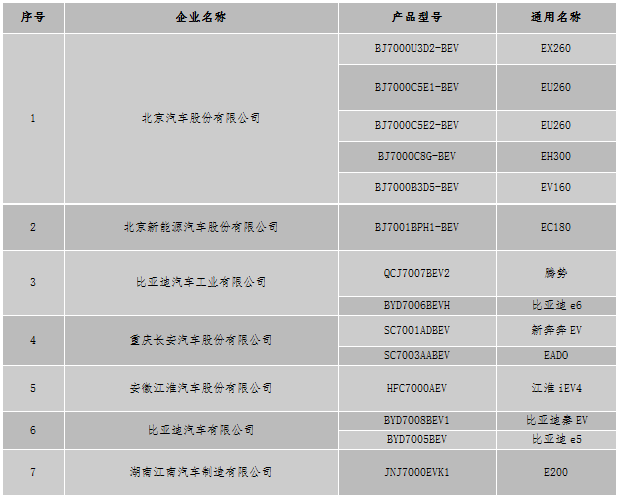 入圍7家車企分別為北京汽車、北汽新能源、比亞迪工業(yè)、重慶長安、江淮汽車、比亞迪和江南汽車。其中北京汽車申報了5款車型,車型涵蓋北汽EX260、EU260、EH300、EV160等;北汽新能源有一款EC180申報;比亞迪申報2款車型,分別為騰勢、比亞迪e6;長安汽車申報了長安新奔奔EV和EADO兩款車型;江淮汽車也申報了一款江淮iEV4;比亞迪申報了比亞迪秦EV和e5兩款車型;江南汽車申報了江南E200一款車型。