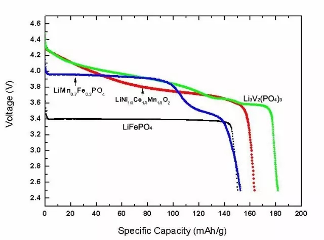 橄欖石結構的磷酸鹽正極材料系列中,除了LiFePO4(LFP),還有LiMnPO4(LMP,4.1V),LiCoPO4(LCP,4.8V),LiNiPO4(LNP,5.2V)和Li3V2(PO4)3(LVP,4.0V,3.7V,3.6V)以及一些相互形成的固溶體材料,圖1比較了這幾種正極材料的放電曲線。