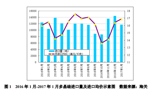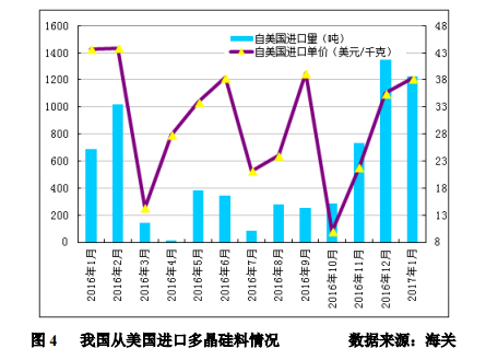 2017年1月份從美國(guó)進(jìn)口多晶硅量為1228噸,環(huán)比減少13.3%;月進(jìn)口均價(jià)回升至38.31美元/千克,環(huán)比漲幅為7.8%。