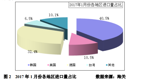 目前我國(guó)多晶硅主要進(jìn)口地區(qū)主要有韓國(guó)、德國(guó)、美國(guó),數(shù)據(jù)顯示,2017年1月份,自韓、德、美這三個(gè)地區(qū)進(jìn)口量9777噸,占總進(jìn)口量的83.4%,進(jìn)口量占比分別為40.5%、32.4%、10.5%,韓國(guó)居首位且占比久居高位,美國(guó)進(jìn)口量也呈增加走勢(shì)。