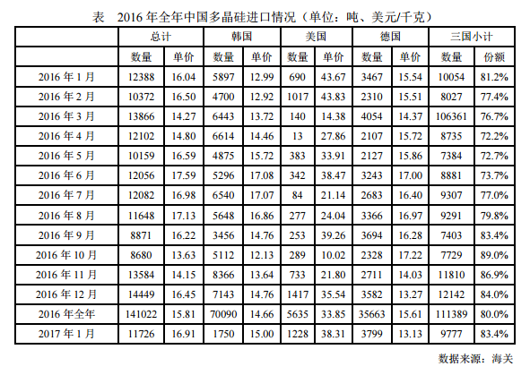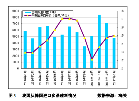 2017年1月份從韓國(guó)進(jìn)口多晶硅量為4750噸,環(huán)比減少33.5%;月進(jìn)口均價(jià)回升至15.0美元/千克,環(huán)比漲幅為1.6%。