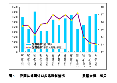 2017年1月份從德國(guó)進(jìn)口多晶硅量為3779噸,環(huán)比增加5.5%;月進(jìn)口均價(jià)下滑至13.13美元/千克,環(huán)比跌幅為1.1%。