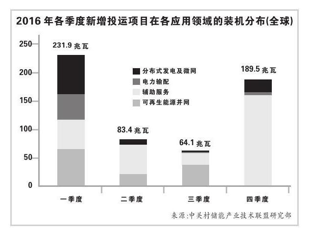 目前,儲(chǔ)能在電力領(lǐng)域的應(yīng)用情況看,基本應(yīng)用在可再生能源并網(wǎng)(專指儲(chǔ)能在集中式風(fēng)電場和光伏電站中的應(yīng)用)、輔助服務(wù)、電力輸配、分布式發(fā)電及微網(wǎng)等領(lǐng)域。《跟蹤報(bào)告》顯示,2016年四季度,全球儲(chǔ)能在輔助服務(wù)領(lǐng)域的投運(yùn)項(xiàng)目裝機(jī)占比最大,占比達(dá)84%,該領(lǐng)域同比增長155%,環(huán)比2016年三季度增長677%;其次是分布式發(fā)電及微網(wǎng)領(lǐng)域,裝機(jī)占比為14%,同比增長317%,環(huán)比2016年三季度增長748%。