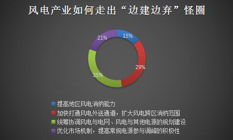 如圖所示,35%的受訪者認(rèn)為,統(tǒng)籌協(xié)調(diào)風(fēng)電與電網(wǎng)、風(fēng)電與其他電源的規(guī)劃建設(shè);29%的受訪者認(rèn)為,加快打通風(fēng)電外送通道,擴(kuò)大風(fēng)電跨區(qū)消納范圍;21%的受訪者認(rèn)為,優(yōu)化市場(chǎng)機(jī)制,提高常規(guī)電源參與調(diào)峰的積極性;15%的受訪者認(rèn)為,提高地區(qū)風(fēng)電消納能力。從數(shù)據(jù)中可以看出,統(tǒng)籌協(xié)調(diào)風(fēng)電與電網(wǎng)、風(fēng)電與其他電源的規(guī)劃建設(shè)成為社會(huì)最受關(guān)注的熱點(diǎn)問題。