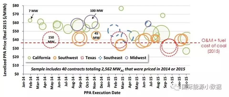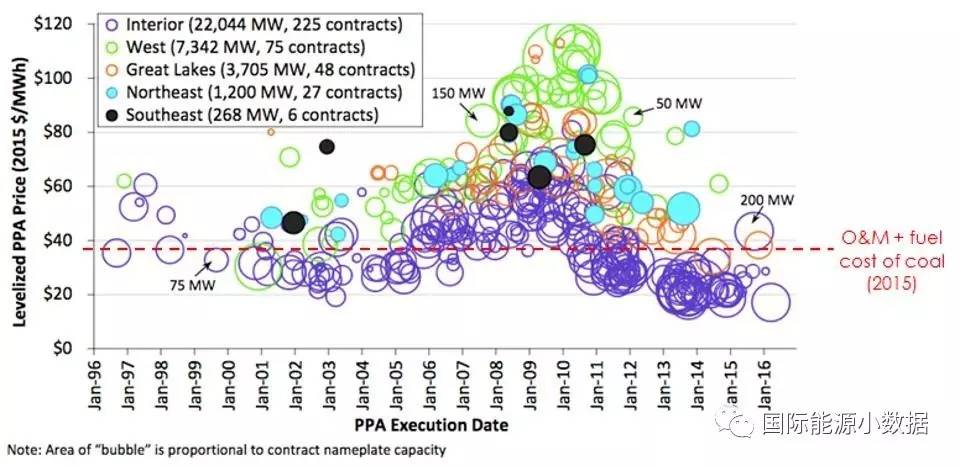 然而,在大多數(shù)的美國(guó)州、縣內(nèi),興建新的煤電廠在財(cái)務(wù)上不合算,光伏和風(fēng)電的平準(zhǔn)成本開始低于老舊煤電的運(yùn)行成本(且不提投資成本),最近美國(guó)光伏項(xiàng)目成本的電價(jià)多在2.5-3.5美分/千瓦時(shí),比煤電廠的運(yùn)行費(fèi)(3.7美分/千瓦時(shí))。所以煤電在發(fā)電量中的占比下降的大趨勢(shì)并非上一屆政府政策推動(dòng)的結(jié)果。在市場(chǎng)力量的作用下,煤炭正在被天然氣、風(fēng)電、光伏所替代。