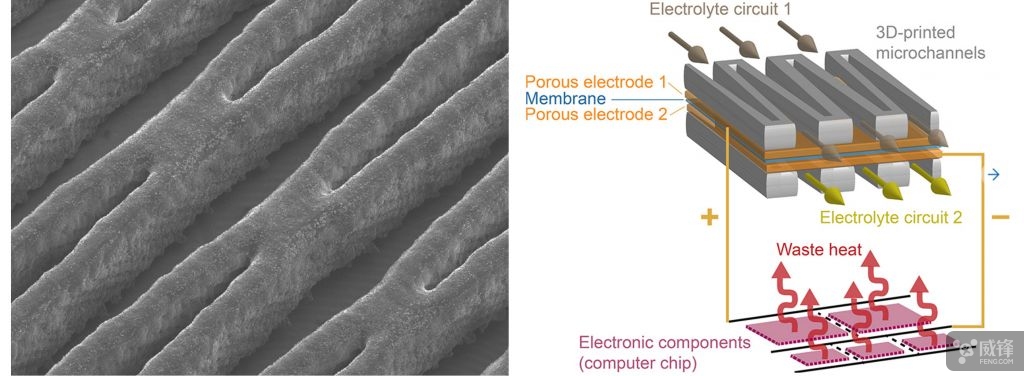 此前的液流電池通常都應(yīng)用在大規(guī)模能量存儲中,例如與風(fēng)電場和太陽能發(fā)電廠組合使用。而把這項(xiàng)技術(shù)用在微型設(shè)備上目前還是首次。新型液流電池的輸出也達(dá)到了新突破,每平方厘米電池表面能產(chǎn)生 1.4 瓦特功率。即使減去將液體電解質(zhì)泵送到電池所需的功率,所得的凈功率密度仍為每平方厘米1瓦特。除此之外研究人員在實(shí)驗(yàn)中發(fā)現(xiàn),電解質(zhì)液體實(shí)際上能夠冷卻芯片。它們散發(fā)的熱量多于電池產(chǎn)生的電能。開發(fā)團(tuán)隊(duì)還使用 3D 打印技術(shù),建立了楔形微通道系統(tǒng)。