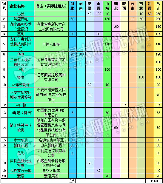 下表為獲得集中式地面電站扶貧指標的Top20企業(yè)統(tǒng)計
