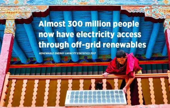 今年也是IRENA第一次將離網(wǎng)可再生能源相關(guān)數(shù)據(jù)納入此報(bào)告。截至2016年底,離網(wǎng)型可再生能源發(fā)電容量達(dá)到了2800MW。其中約40%來自太陽能,10%來自水能。其余最大比例則來自生物質(zhì)能。據(jù)估算,全球有多達(dá)六千萬戶家庭(或3億人口)由此獲益。