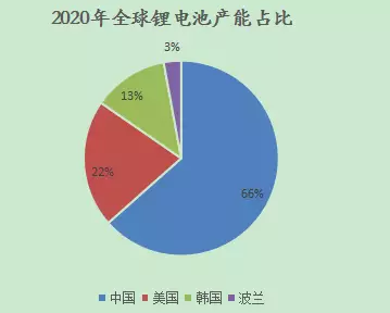 中國(guó)鋰離子電池行業(yè)正在占據(jù)世界領(lǐng)先地位。據(jù)倫敦業(yè)界知名研究機(jī)構(gòu)英國(guó)基準(zhǔn)礦業(yè)情報(bào)估計(jì),至2020年中國(guó)約占全球鋰電池62%的產(chǎn)能,而其后依次是美國(guó)的22%,韓國(guó)的13%以及波蘭的3%。
