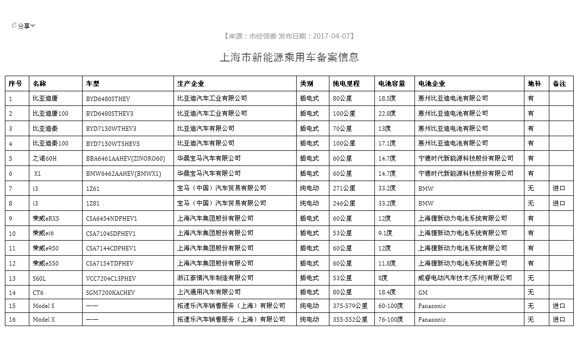 中國儲能網(wǎng)訊:4月7日,上海市經(jīng)濟(jì)和信息化委員會發(fā)布了2017年3月上海市新能源汽車備案信息,共有16款車型進(jìn)入備案,包括12款插電式車型與4款純電動車。