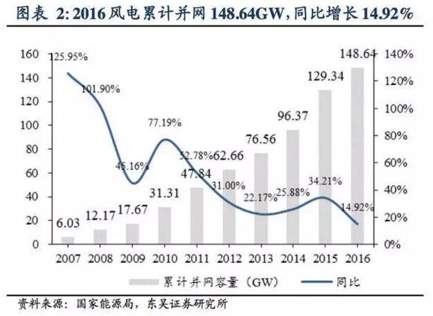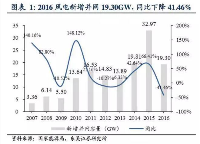 新增并網(wǎng)裝機(jī)19.30GW,同比下降 41.46%:2017年1月26日,國(guó) 家能源局發(fā)布2016年風(fēng)電并網(wǎng)運(yùn)行情況。2016年全年新增風(fēng)電裝機(jī)19.30GW,同比下降41.46%;累計(jì)并網(wǎng)裝機(jī)達(dá)到148.64GW,同比增長(zhǎng)14.92%。2016 年是我國(guó)風(fēng)電開(kāi)發(fā)往東部、南部轉(zhuǎn)移的突破之年,風(fēng)電布局進(jìn)一步優(yōu)化。受南方施工條件復(fù)雜以及夏季雨季、汛期的影響,施工周期拉長(zhǎng),并網(wǎng)進(jìn)度延緩。