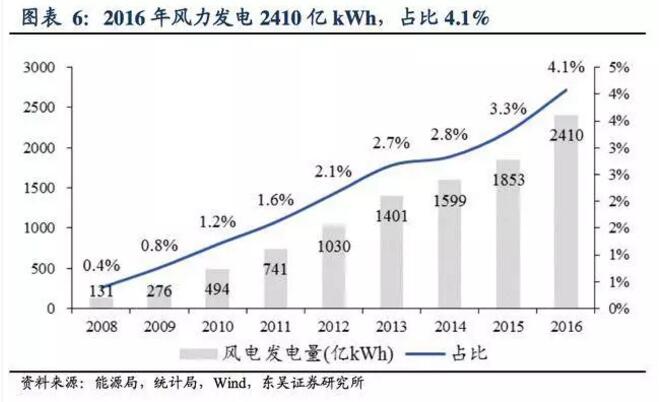 發(fā)電量占比4.1%,上升0.8個(gè)百分點(diǎn):發(fā)電量方面,2016年全國(guó)風(fēng) 電發(fā)電量 2410 億千瓦時(shí),占全部發(fā)電量的4.1%同比上升了0.8個(gè)百分點(diǎn),份額進(jìn)一步提升。