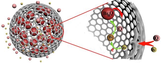 該研究團(tuán)隊(duì)設(shè)計(jì)了一類中空多孔納米籠狀材料,其外殼的孔徑介于溴離子和絡(luò)合態(tài)溴之間;利用“孔徑篩分效應(yīng)”,使溴離子在籠內(nèi)部發(fā)生電化學(xué)反應(yīng)后“固定”在內(nèi)部,從而有效抑制溴的交叉污染。采用該材料組裝的單電池在80mA/cm2充放電條件下,庫(kù)倫效率達(dá)到98%,能量效率達(dá)到81%。該工作為溴基液流電池電極材料的設(shè)計(jì)制備提供了新思路。