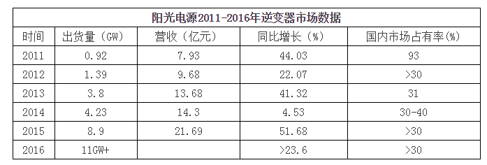2016年,陽光電源光伏逆變器全球出貨超11GW,其中國內(nèi)出貨10GW,牢牢把握住了2016年國內(nèi)近30GW新增裝機(jī)項(xiàng)目的發(fā)展紅利。3月底SMA發(fā)布年報(bào)披露其2016年的發(fā)貨量為8.2GW,陽光電源進(jìn)一步拉開了自己與這家老牌企業(yè)之間的距離,發(fā)貨量連續(xù)兩年全球第一。