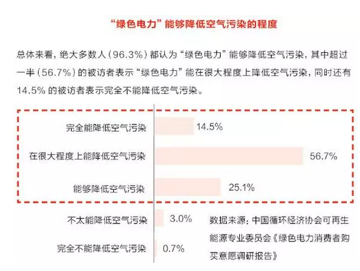 一份中國(guó)循環(huán)經(jīng)濟(jì)協(xié)會(huì)可再生能源專業(yè)委員會(huì)于2016年8月做的綠色電力消費(fèi)者購(gòu)買意愿調(diào)研報(bào)告顯示,超過(guò)八成的公眾知曉綠色電力,并認(rèn)為綠色電力能夠在一定程度上降低空氣污染。絕大多數(shù)人(97.6%)表示愿意購(gòu)買綠色電力,其中四成被訪者表示一定會(huì)購(gòu)買。在愿意購(gòu)買綠色電力的基礎(chǔ)上,大多數(shù)人(超過(guò)九成)可以接受一定程度上的費(fèi)用增加。市場(chǎng)調(diào)查結(jié)果顯示,大量的城市居民已經(jīng)有充分的意識(shí)到使用綠色電力能夠減少空氣污染,甚至愿意為綠色電力支付更高的費(fèi)用,卻苦于沒(méi)有選擇的權(quán)力和購(gòu)買的渠道。